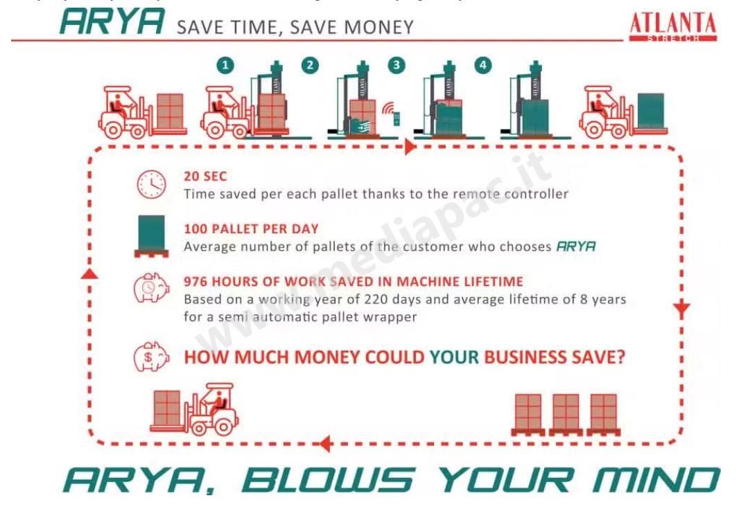ARYA consente di ottimizzare al meglio i tempi di lavorazione, poiché non richiede l’intervento dell’operatore per agganciare il film al pallet. In questo modo, gli operatori potranno dedicarsi al resto della filiera con minore sforzo e ottimizzazione