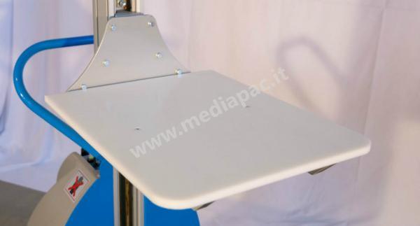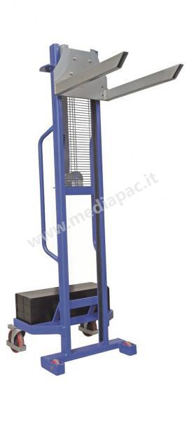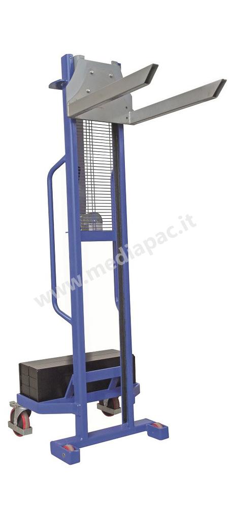Nuovo HANDY CB, mini elevatore manuale contrappesato, portata 100 kg elevazione 1500 mm, con due ruote pivotanti con il freno e due rulli stabilizzatore fissi.