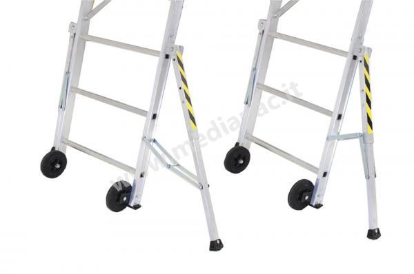 Conforme alle nuove Norme Europee UNIEN131/7 sulle scale a castello offre una protezione a 360° e un evoluto sistema anti-ribaltamento che può essere richiuso per consentire di lavorare anche contro una parete. Dotata di gradini piani di salita.