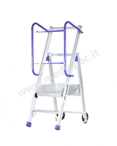 Costruita in base alle Norme Italiane nasce per lavorare sugli scaffali dei supermercati o magazzini in sostituzione di piccolo sgabelli pericolosi per molte applicazioni.