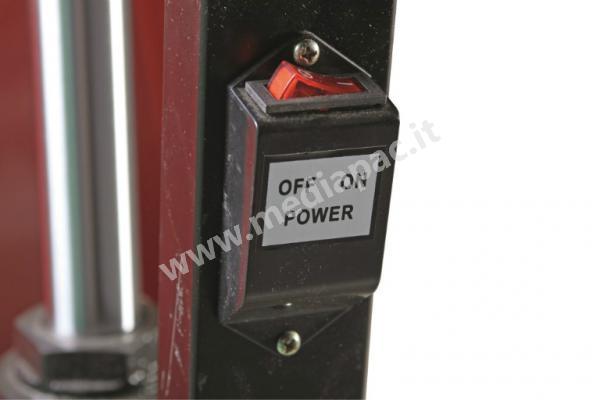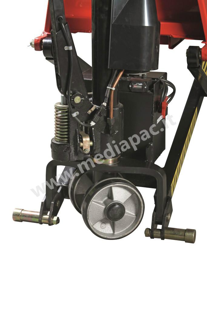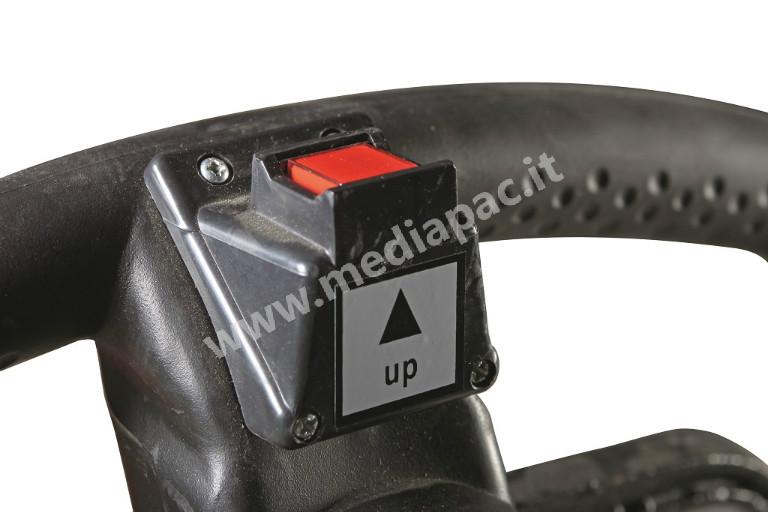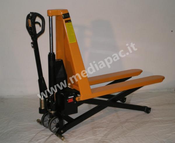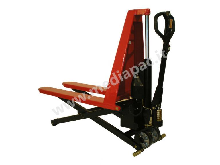 Transpallet a pantografo con trazione manuale, elevazione forche sia elettrica che manuale e discesa forche tramite leva a timone. Cilindro a sfilo singolo e frontale alto.