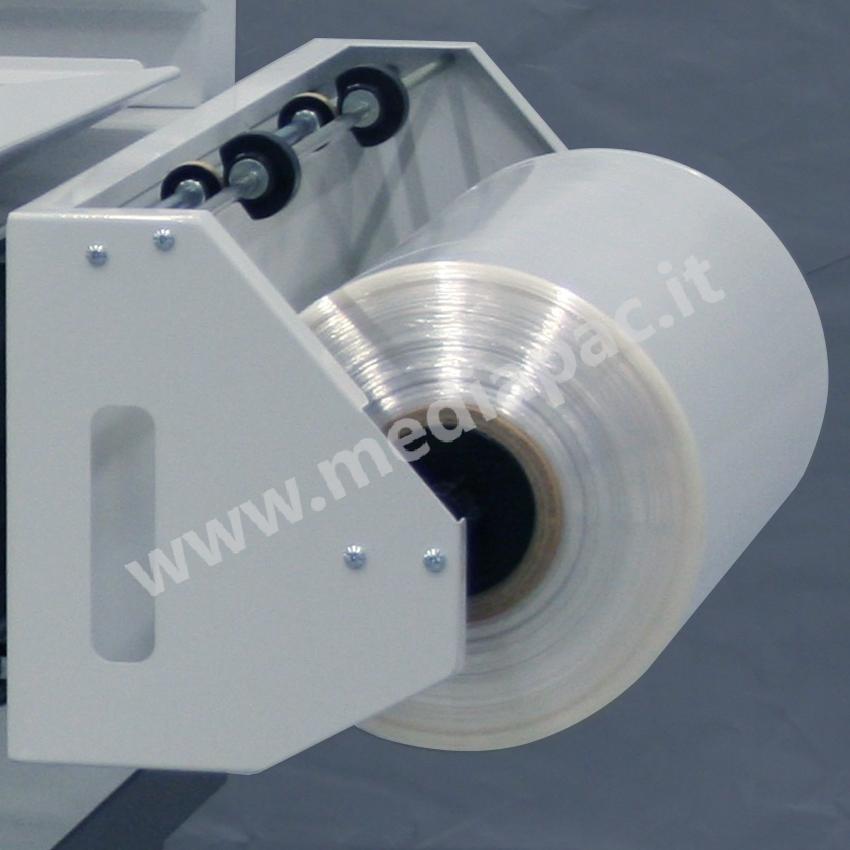 Piatto portaprodotto mobile, svincolato dal supporto della bobina film per un migliore adattamento del film alle dimensioni del pacco da confezionare