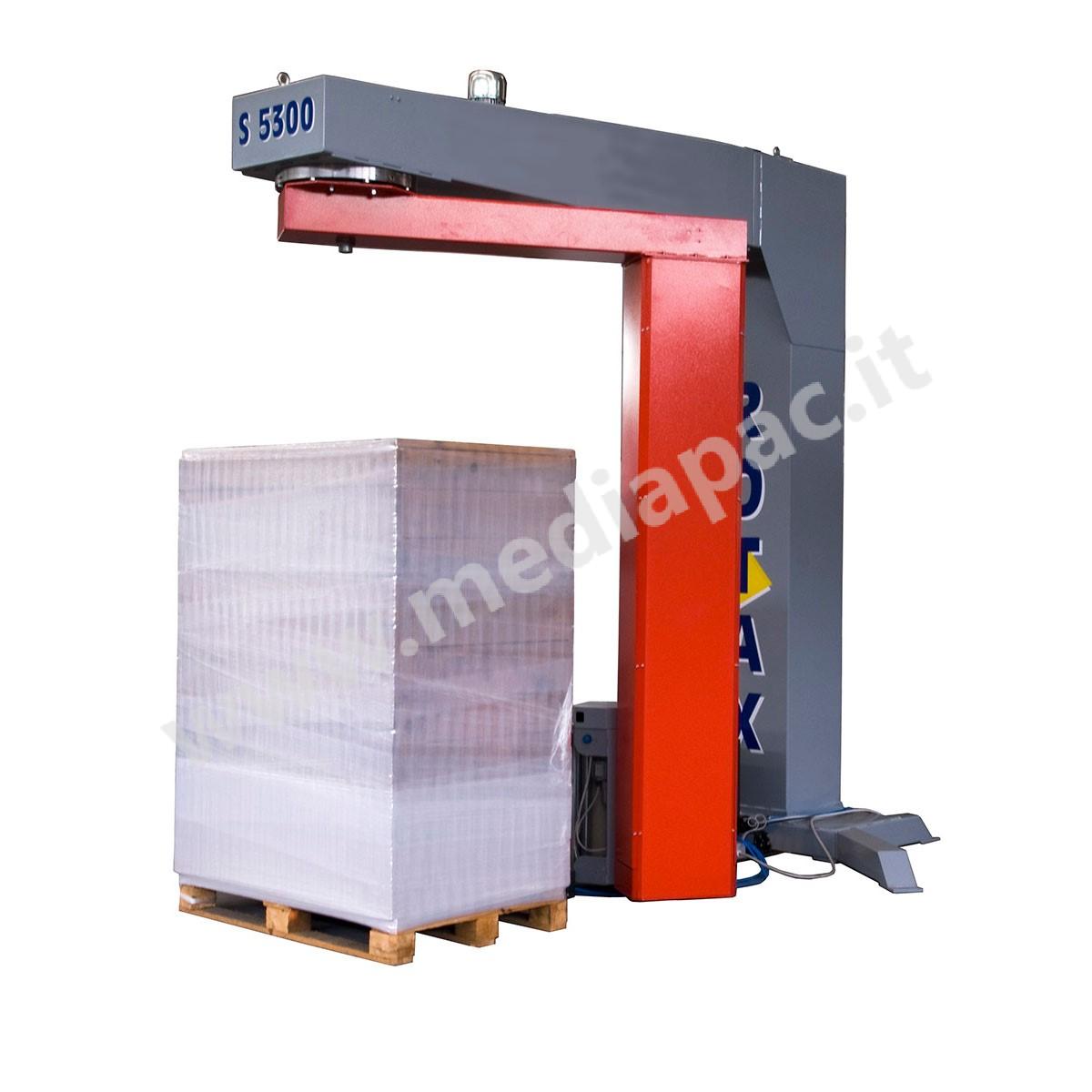 Rotax S5300, macchina avvolgitrice a braccio rotante completamente automatica, è equipaggiata con prestiro motorizzato che permette un sensibile risparmio di film utilizzato.