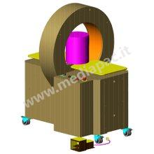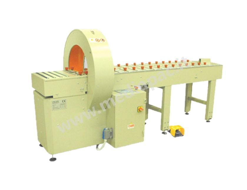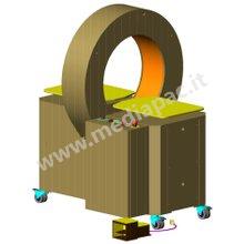 Macchina per il bloccaggio di prodotti su basi di cartone preformati, mediante l'avvolgimento  con film estensibile. piano a rulli autocentranti per il caricamento della base di cartone e prodotto. Sistema di aggancio e taglio del film, mandrino porta bobina ad innesto rapido, inverter per la variazione delle velocità trasporto/avvolgimento, rulliera di uscita motorizzata per espulsione prodotto. Macchina controllata da PLC con pannello operatore.
