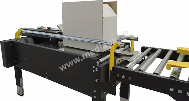 In seguito, grazie all'azionamento di un cilindro pneumatico, è possibile spingere il cartone in una nastratrice a formato fisso per la sigillatura con nastro adesivo.