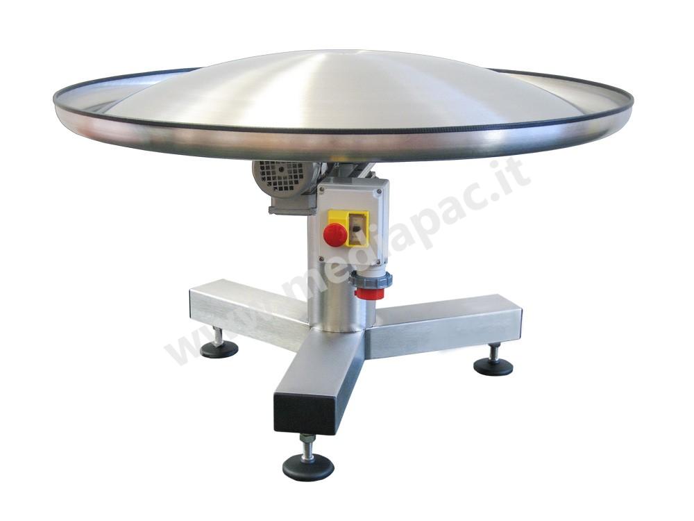 Il Tavolo Rotante Convesso, al contrario del Tavolo Rotante Concavo ha la particolarità di raccogliere i prodotti depositati nel centro del vassoio, tramite nastro trasportatore o scivolo, e convogliarli verso il bordo esterno. Collocato nella parte finale della linea di confezionamento, svolgono la funzione di “serbatoio di accumulo”. Facilitano la fase di scarico del prodotto in uscita dalla macchina confezionatrice e agevolano le operazioni di prelevamento e inscatolamento dell’operatore.