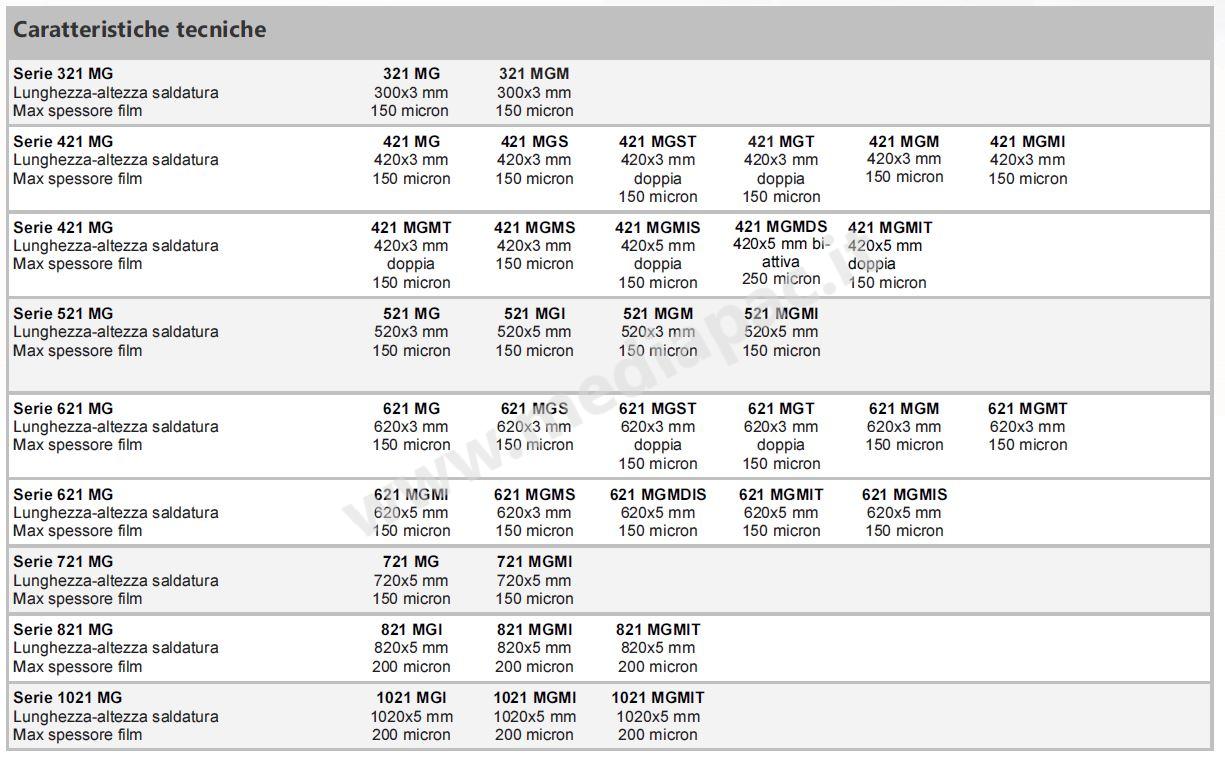 Termosaldatrici ad impulsi termici temporizzate, indicate per PE, PP, PVC e laminati leggeri