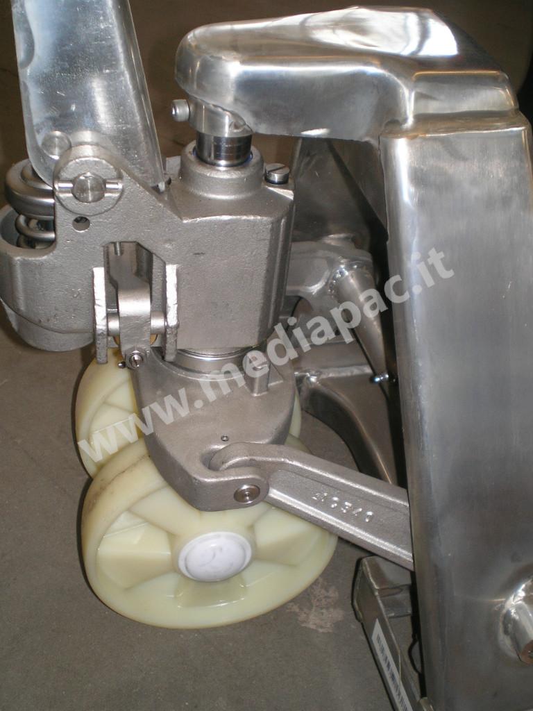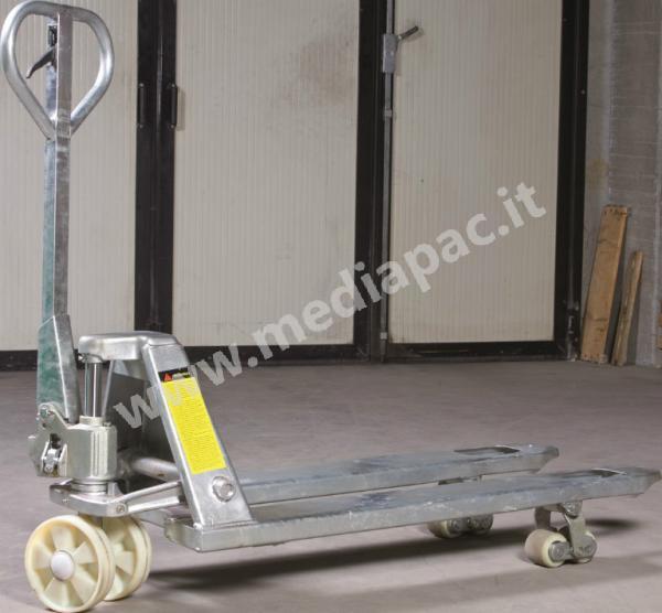 Transpallet manuale con telaio e perneria completamente zincati a caldo. Disponibile con ruote e rulli siongoli o doppi in nylon. Ideale per la movimentazione di merci in ambienti a basso rischio di corrosione.