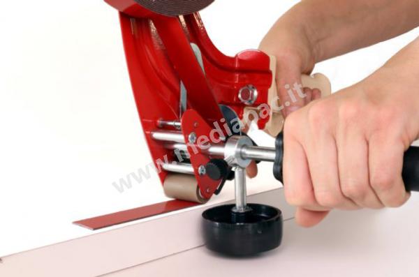 Un rullo guida applicabile alla fiancata destra o sinistra permette l’ applicazione del nastro seguendo un riferimento.