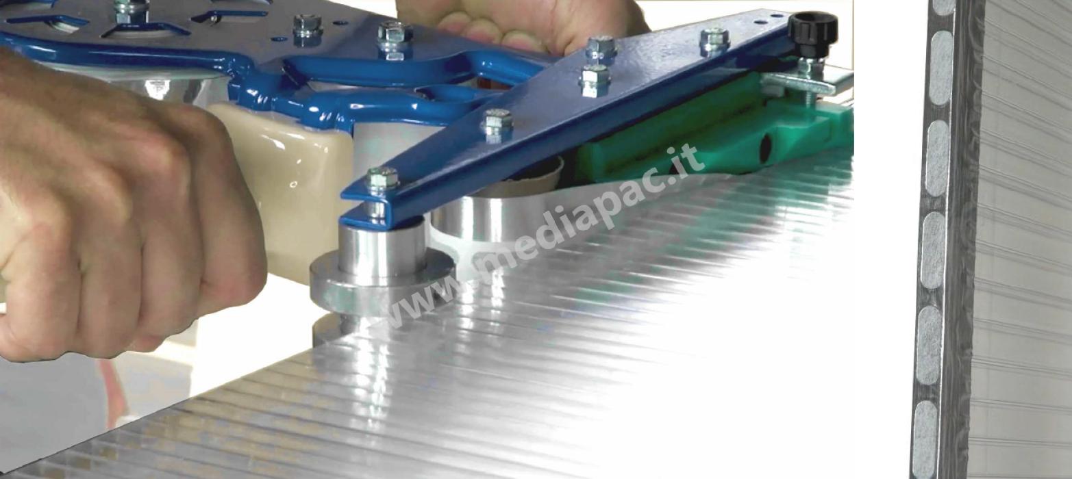 Questi dispenser permettono di sigillare il lato aperto delle lastre di policarbonato alveolare utilizzando nastri adesivi in alluminio o poliestere con o senza liner. Questa operazione viene eseguita per evitare l’ingresso di insetti, polvere e umidità tra le due superfici. Questo non è solo un problema estetico ma nel caso di coperture di serre genera anche un danno economico in quanto diminuisce il passaggio della luce riducendo la produzione. L’applicazione manuale di questi nastri è difficoltosa e lenta. Il dispenser permette un’applicazione professionale e veloce. Inoltre l’uso manuale di nastri in alluminio causa piccoli ma fastidiosi tagli alla mano. Il dispenser elimina questo inconveniente.